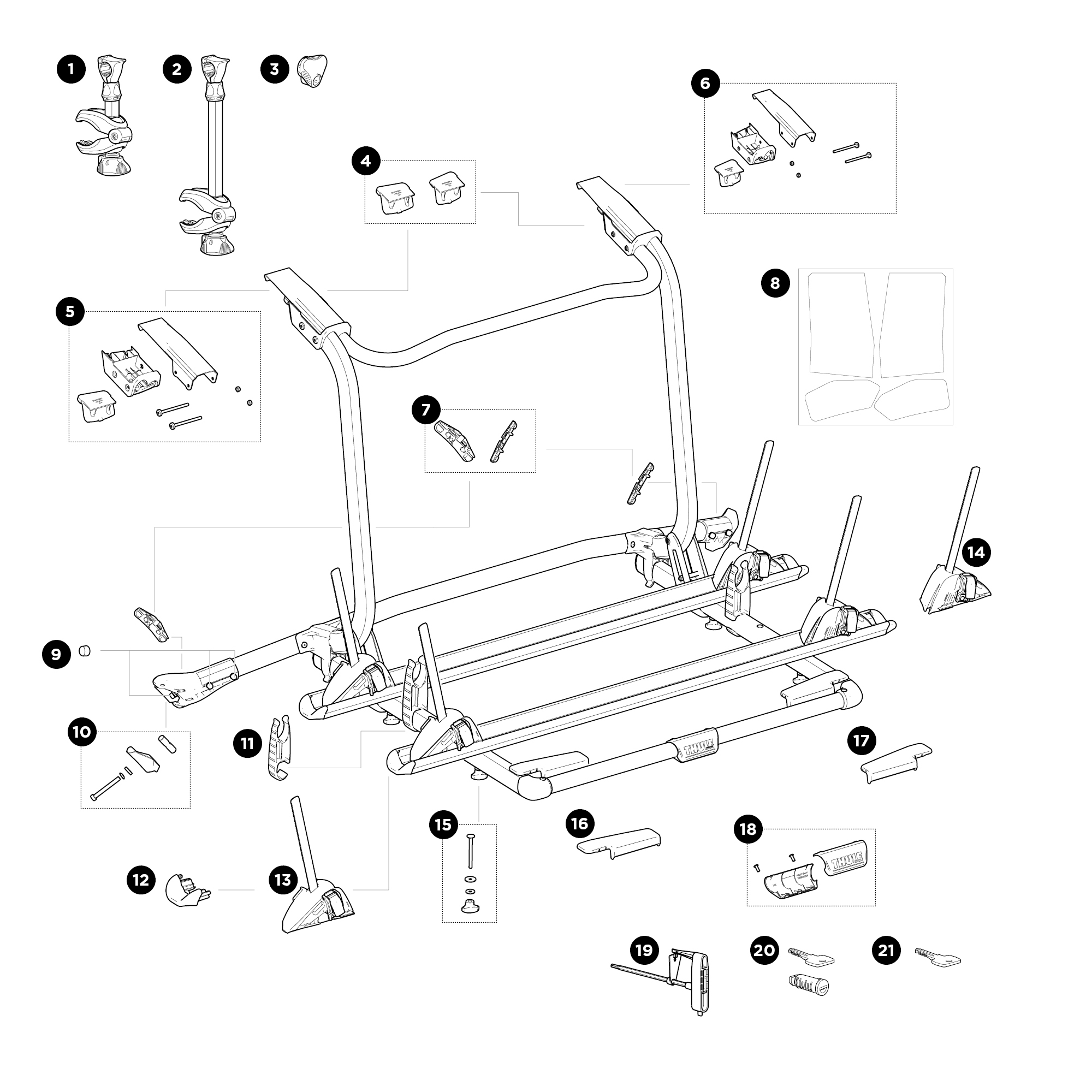 A teherbírás akár 4 kerékpárra növelhető, kiegészítve egy harmadik kerékpárral és egy negyedik kerékpár adapterrel (adapterek külön megvásárolhatók). A kerékpártartó emelt kialakítása miatt a hátsó lámpák és a rendszámtábla látható marad. A kerékpárok rögzítése egyszerű a levehető vázrögzítő karral, mely Thule AcuTight nyomatékszabályzós gombokkal rendelkezik, amelyek az optimális nyomaték elérésekor kattannak. A kerékpárok egyszerűen felrakhatók a balról jobbra csúszó könnyen beállítható síneknek köszönhetően. A kerekek egyszerű rögzítése a racsnizható csattal felszerelt állítható keréktartóknak köszönhetően. A platform függőlegesen felhajtható a csomagtartóhoz, ha nem használja. A kerékpárok zárhatóak a kerékpárszállítóra (a zárt tartalmazza). A jármű csomagtartója felszerelt kerékpárok nélkül nyitható ki.