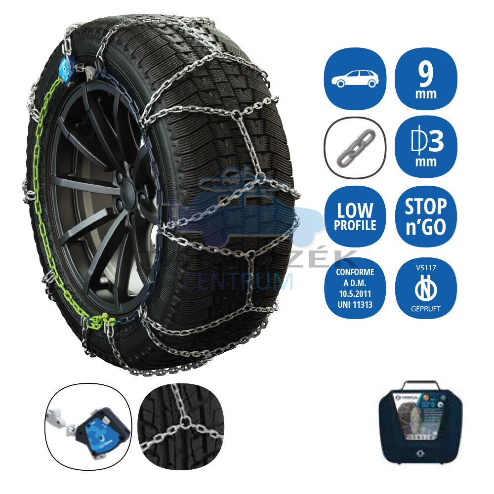 Veriga Stopn&Go 9 mm-es lánc automatikus feszítéssel és a lánc központosításával. Egy szabadalmaztatott önfeszítő és öncentráló „STOP&GO” készülék. A jármű leállítása és a lánc megfeszítése nem szükséges.